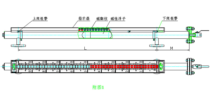 结构原理 液位计根据浮子原理和磁性耦合作用研制而成。当被测容器中的液位升降时,液位计主导管中的浮子也随之升降,浮子内的永久磁钢通过磁耦合传递到现场指示器,驱动红、白翻柱翻转 180 °,当液位上升时,翻柱由白色转为红色,当液位下降时,翻柱由红色转为白色,指示器的红、白界位处为容器内介质液位的实际调高度,从而实现液位的指示。